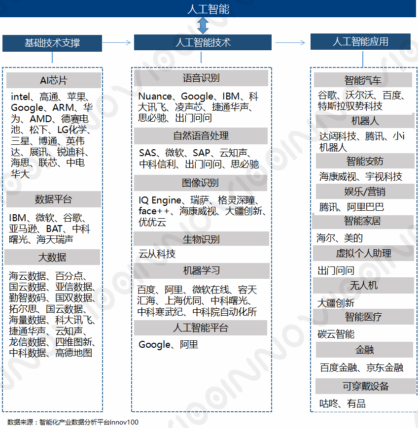 摘要:AlphaGo战胜李世石,人工智能迎来发展高峰,政府,企业纷纷布局人工智能,这会使人工智能产业不断向前发展,同时也会让更多的人工智能产品走进人们的生活。 国内时间8月31日,微软与亚马逊这两大巨头达成了有史以来的最大合作,即在人工智能领域,未来微软Cortana将可以与亚马逊Alexa互相唤醒,双方将同时打通win10以及echo智能音箱。 2017年5月23日-27日柯洁与AlphaGo在“中国乌镇·围棋峰会”展开对弈,之后连输3盘。最终输给了 AlphaGo,其实在早几年 AlphaGo就已经赢下了很多人类选手,2016年master对战人类顶尖高手的战绩是60胜0负,master就是AlphaGo。它带来了人们对人工智能的关注,但是在它之后 人工智能又将何去何从? 最新数据显示,目前全球人工智能企业总数达2542家,其中中国拥有592家,占据23%,排名全球第二,仅2016年一年,中国在人工智能领域就有超过200亿元的投资资金。越来越多的风险投资刺激了资本市场,近期人工智能概念个股大幅上涨。 人工智能不仅仅是科学革命,更悄然改变人们日常生活的方方面面。当韩国棋王李世石在与谷歌AlphaGo的比拼中投子认输的那一刻,人类既震惊于人工智能已经可以超越人类的水平,也开始将更多的目光投入人工智能这一领域,殊不知在经历了60年的发展历程之后,在金融业、汽车制造业、医疗保健行业甚至艺术创作领域这些似乎与人工智能并不那么相关的行业,都已经逐步实现了人工智能的应用。 根据智能化产业数据分析平台innov100根据数据分析显示, 中国人工智能产业规模2016年达到239亿,预计2017年增长率将提高至51.2%,产业规模达到342.5亿元,并于2019年增长至844亿元。在《新一代人工智能发展规划》中提到把人工智能定位为经济核心驱动力:规划指出到2020年,人工智能成为新经济增长点,核心产业规模超过1500亿元,带动相关产业规模1万亿元。到2025年成为带动经济转型升级主要动力,核心产值规模超过4000亿元,带动相关产业规模5万亿元。到2030年产业规模超过1万亿,带动相关产业规模10万亿元。在未来通用智能时代,除了自然语言处理、计算机视觉等AI技术在某些领域的直接应用,人工智能更大的影响在于将重塑生活服务、医疗、零售、数字营销、农业、工业、商业等各行各业,并将引发新一轮IT设备投资周期。智能化的大潮即将来袭,万亿元的市场规模值得期待。只有更早的加入到人工智能的行业来,才能更早的,更好的占领市场。 近日,国务院印发《新一代人工智能发展规划》,明确指出人工智能成为国际竞争的新焦点,应逐步开展全民智能教育项目,在中小学阶段设置人工智能相关课程、逐步推广编程教育、建设人工智能学科,培养复合型人才,形成我国人工智能人才高地。 实际上,在基础教育阶段进行AI教育提前布局的不止是中国,2016年初美国前任总统奥巴马曾投入40亿美金,称要让每个美国孩子在小学具备最简单的编程能力。谷歌、微软、Facebook等科技巨头公司也积极参与。 各个国家都在不遗余力的发展人工智能,考察人工智能领域的全球图景,人工智能已然成为国际竞争的新焦点。美国成立研究部门,专门制定与人工智能相关的发展战略,2016年发布《国家人工智能研究与发展策略规划》和实施计划;日本出台推进战略,为人工智能谋划蓝图;新加坡推出国家人工智能计划,以促进和提升新加坡的人工智能实力;韩国启动人工智能“BRAIN”计划,主要致力于研究认知、决策和指挥行动的脑部活动……随着竞争日趋白热化,抢占人工智能发展制高点迫在眉睫。 不仅仅是国家政府纷纷重视,很多企业也都把目光转向人工智能。人工智能涉及到的领域也是很多可以给这些政府,企业提供一个很好的,有竞争力的平台。 人工智能产业链大致分为基础层、技术层、应用层三个层次: 基础层主要由芯片及传感器研发、数据资源、运算平台构成,包括数据的传输、存储、运算等功能,对应计算智能阶段。 技术层主要依托基础层的数据资源和运算平台进行机器学习建模,开发面向不同领域的应用技术,主要包括语音识别、图像识别、生物识别及自然语言处理等感知智能技术和机器学习、预测类API及人工智能平台等认知智能技术。 应用层主要是基于基础层与技术层实现与传统产业融合,实现不同场景应用,为用户带来更便捷更优质的体验,如机器人、智能汽车、智能家居、智慧医疗、智慧农业等。 根据智能化产业数据分析平台innov100的投融资数据库分析,人工智能产业已经成为近几年的投资热点了,下面是一些企业投资人工智能产业的汇总: 创投融行业都瞄准新一代人工智能,会使得这个市场更加繁荣起来,再有国家政策的支持,更多的人工智能人才出现,也将使这个市场更加活跃。这些个企业把目光面向了更多的领域,下面是智能化产业数据分析平台innov100的一副智能产业链图,可以详细的看出智能产业的面貌。 很多的专家学者认为只有人工智能才能为“万物互联”之后的应用问题提供最完美的解决方案,它将成为IT领域最重要的技术革命,目前市场关心的IT和互联网领域的几乎所有主题和热点(智能硬件、O2O、机器人、无人机、工业4.0),发展突破的关键环节都是人工智能。 赛智产业研究院研究员张超认为,人工智能将像水和电一样无所不在,进入到教育、医疗、金融、交通、智慧城市等行业,一个全新的“人工智能+”时代正在到来,