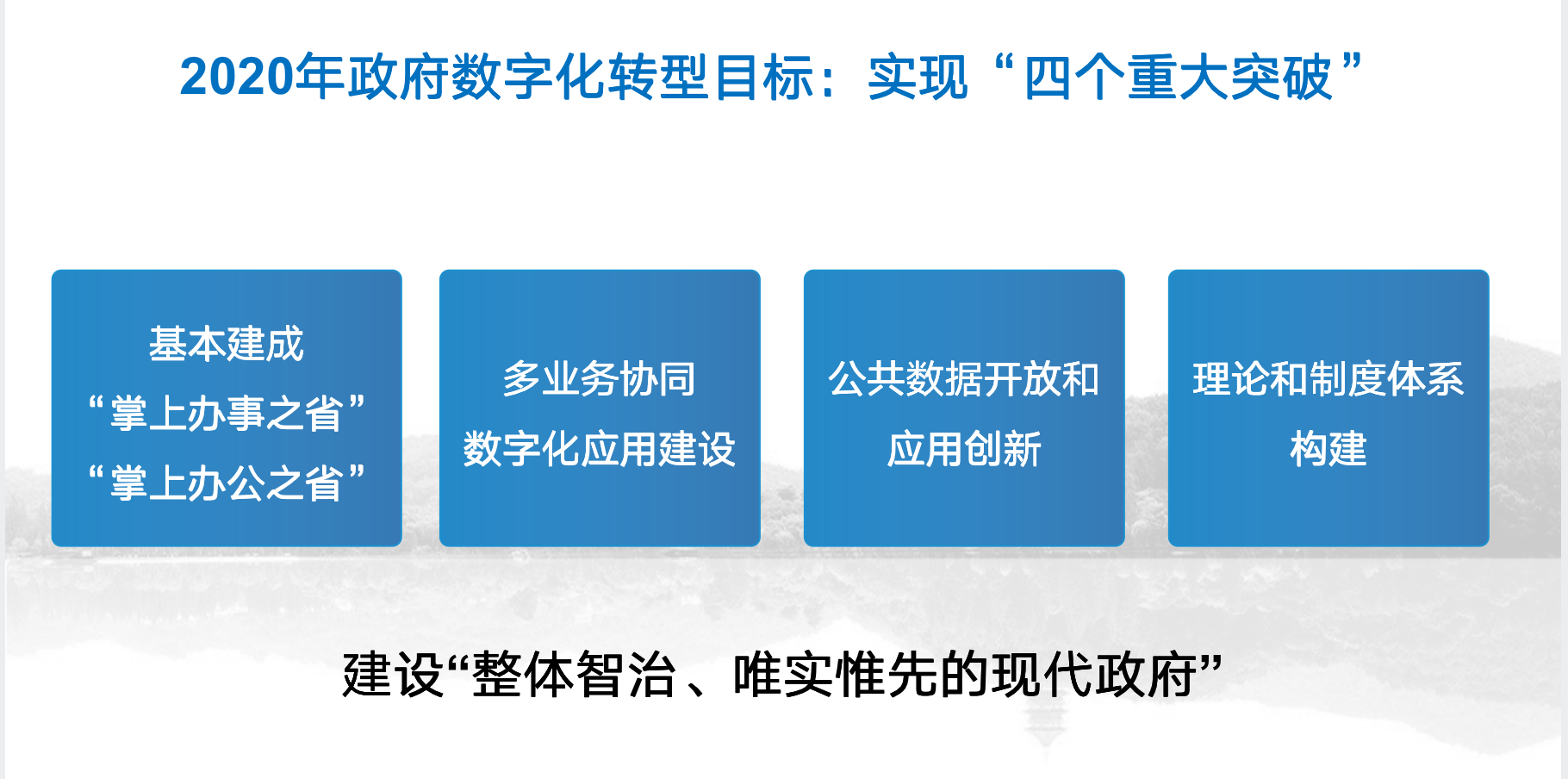 7月10日,首届中国•安吉“两山”数字论坛举行。在此次论坛上,浙江省大数据局副局长陈瑜作了题为《政府数字化转型》的发言,他回顾了浙江省政府数字化转型的历程,阐述了“整体智治、唯实惟先”现代政府的内涵,并介绍了浙江省疫情防控“一库一码一图一指数”实践,最后提出了地方数字政府建设思路。在此,特刊登浙江省大数据局副局长陈瑜在论坛上的精彩发言。 各位领导、各位来宾: 首先,我代表浙江省大数据发展管理局,对安吉“两山”数字论坛的召开表示热烈的祝贺,向长期以来一直支持数字政府建设以及积极投身数字政府建设的各位来宾表示衷心的感谢。 借此机会,我给大家简单分享一下《政府数字化转型》。建设数字政府是我们的目标,用袁家军省长的话来说,“建设数字政府是一个长期的过程,这个过程就是我们政府所有行业、所有领域的数字化”,所以我们浙江把这个工作叫“数字化转型”。 01 浙江省政府数字化转型历程 数字政府有五大特征。首先是整体政府,其次还是服务型政府、法制政府、廉洁政府、效能政府,最终是实现政府治理体系和治理能力的现代化。 从全球来看,数字政府建设是大势所趋。党中央和国务院非常重视数字政府的建设。总书记在历次的大会上,都作了强调。今年三月,习近平总书记在浙江考察时强调,“推进国家治理体系和治理能力现代化,必须抓好城市治理体系和治理能力现代化”,并希望杭州在建设城市大脑方面继续探索创新,进一步挖掘城市发展潜力,加快建设智慧城市,为全国创造更多可推广的经验。 浙江的省域治理现代化之路一脉相承,一以贯之。2003年,时任浙江省委书记的习近平提出:“数字浙江”是全面推进浙江省国民经济和社会信息化、以信息化带动工业化的基础性工程。从2003年开始,浙江省建设“数字浙江”就坚持一张蓝图绘到底。2014年,浙江省提出了“四张清单一张网”,开始建设浙江政务服务网。到了2016年,我们提出了“最多跑一次”改革。到了2018年,我们提出要建设“数字政府”。到2020年,在总结疫情防控、复工复产经验时,省委省政府提出了要建设“整体智治,唯实惟先”的现代政府。 浙江政府数字化转型的总体思路是“12126”:1是一面旗帜,就是高举“最多跑一次”改革这个浙江的金名片;2个目标是掌上办公和掌上办事,一个是给老百姓服务,一个是政府自身的运行;1个支撑,公共数据平台;2大模型,一个是数据共享模型,一个是业务协同模型;6大领域指的是,政府履职的五大领域:经济调节、市场监管、公共服务、社会管理、环境保护,加上我们政府自身运行,正好是6个领域。 在提出政府数字化转型以后,浙江是通过重点标志性的项目建设,来带动全省各级政府、各个部门的数字化转型。这几年来,我们已经建成了很多应用。 首先,2018年我们提出了建设“8+13”重大项目。这8个项目里面有“浙政钉”、“浙里办”、基层治理四平台、经济运行监测分析数字化平台等大平台;“13”主要是各个省级部门在履职过程中的一些重大项目。2019年,根据中央防范重大风险的要求,浙江省启动了10个风险防范的项目,有不少已经投入使用。到了今年,我们根据新的“整体智治”要求,又谋划了11个多业务协同的重大项目。其中“省域空间治理”的数字化平台非常重要,中央把整个省域的规划、治理放权放给了浙江。 02 建设“整体智治、唯实惟先”的现代政府 2020年的任务,要实现四个突破。一个是两掌的突破,基本建成“掌上办事之省”“掌上办公之省”;第二个是多业务协同数字化应用建设的突破;第三个是公共数据开放共享的突破;第四个是理论和制度体系构建的突破。浙江的实践已经很丰富了,需要上升为理论,成为一整套的数字政府建设理论,谋划好十四五规划,建设“整体智治、唯实惟先”的现代政府。 我简单介绍下“整体智治,唯实惟先”这个理念。 “整体”就是整体政府的理念,关键词是改革和协同。对群众来说,就是从“找部门”到“找政府”;对于政府各级部门来说,就是从碎片化的服务变成一体化的服务;从政府自身运行来看,就是通过业务协同、数据共享、流程再造,实现数据多流转、多部门在线协同;最后在技术上,网络化实现全天候、全在线,平台化实现全参与、全应用。 “智治”主要体现为基于数字化的智慧化治理,通过大数据、云计算的算力实现场景化、智能化的多业务协同应用。 “唯实惟先”既是我们的文化和核心价值观,也是检验实际成果的标准。“实”即务实,真正达到便民利企、提高群众生活水平、提升政府治理能力。“先” 即先进,要用最先进的文化,最先进的生产力,最先进的技术推动数字经济的发展,推动整个数字社会的发展。 “唯实惟先”要靠政府以及广大社会各界的多元共治来实现,实施主体和服务对象角色融合,既是服务提供者,又是服务参与者和被服务者。 03 疫情防控“一库一码一图一指数”实践 在本次疫情防控中,浙江省通过“一库一码一图一指数”开展防疫控疫和复工复产实践,基于“整体智治、精密智控”理念,实现“两手硬、两战赢”。 一库,就是重点人员管控库。它的数据不仅包括政府公共数据平台上原有的数据,还有来自多个运营商以及社会各界的数据。一库的数据量比较大,涵盖范围比较广,但是不够精准。而网格化,是通过基层